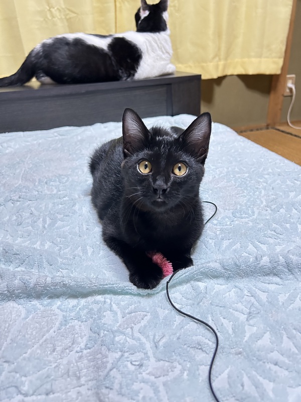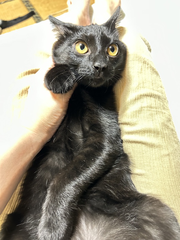 | 特徴(性格など) | 毛色は全身黒、短毛、しっぽは真っ直ぐ長いです。平均的に順調に育っていると思います。良く遊び、よく食べます。トイレもできます。人見知りしますが慣れると人懐こい性格でべったり甘えん坊です。 | ||