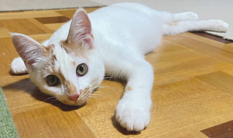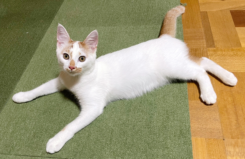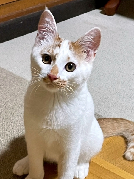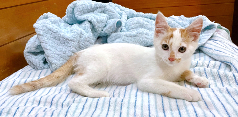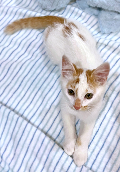 | 特徴(性格など) | 【仮名】シュロ 【性別】オス 【毛色】白地に赤トラの模様がポツポツとあります。 (参考写真の最後の2枚は7月撮影のものです) とにかく人懐っこいです。 誰に対してもすぐ懐きよく喉をゴロゴロならしています。 抱っこもすんなりとできます。 子猫らしく元気でやんちゃで、食いしん坊です。 |