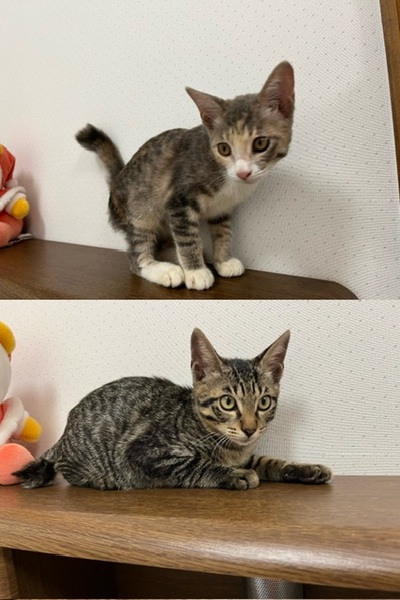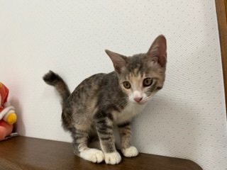 | 特徴(性格など) | 好奇心旺盛で元気です。 エサも普通のカリカリのエサを食べることができます。 トイレのしつけも済みです。 メス(三毛)、オス(キジトラ) 生後 4ヶ月。 |