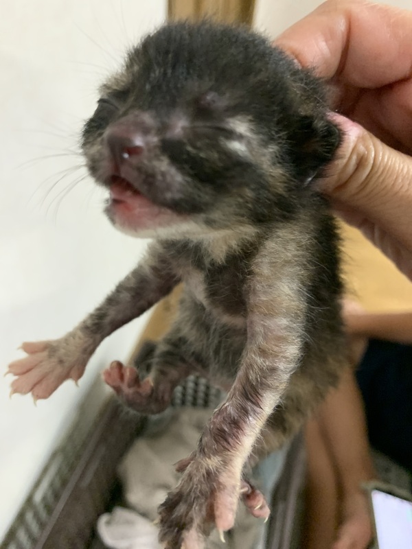 | 特徴(性格など) | サビ柄なのでメスだとおもいます。 目もあいていません。 |