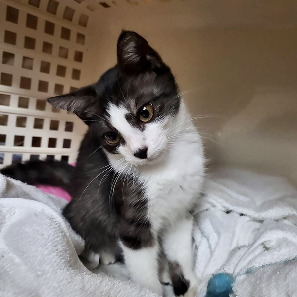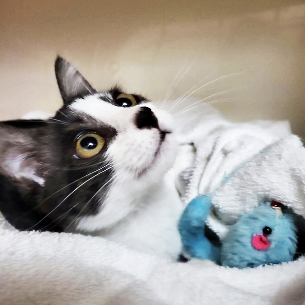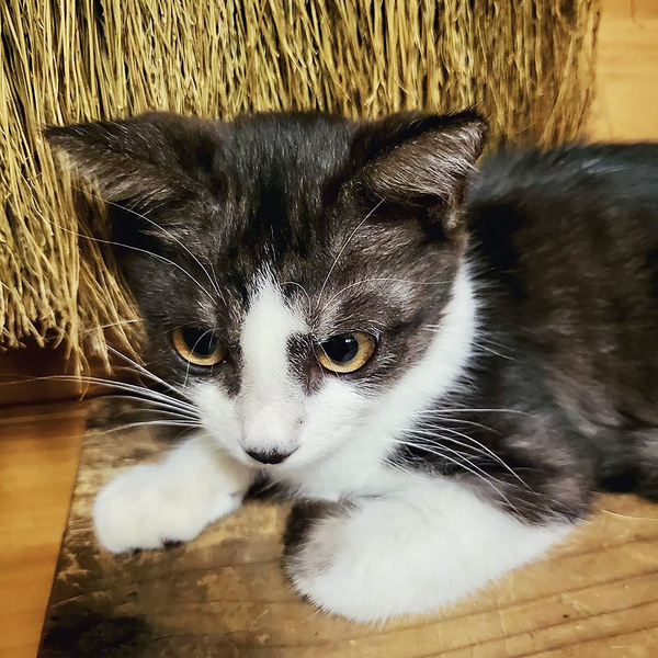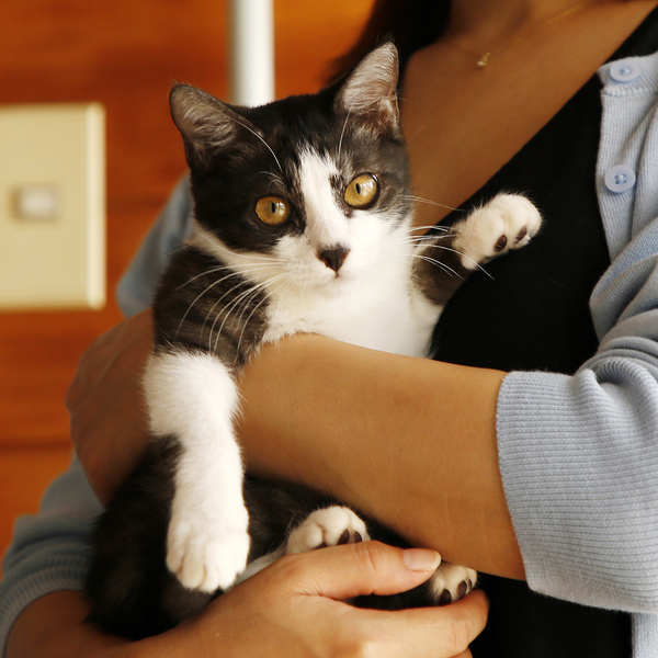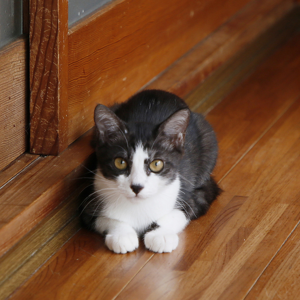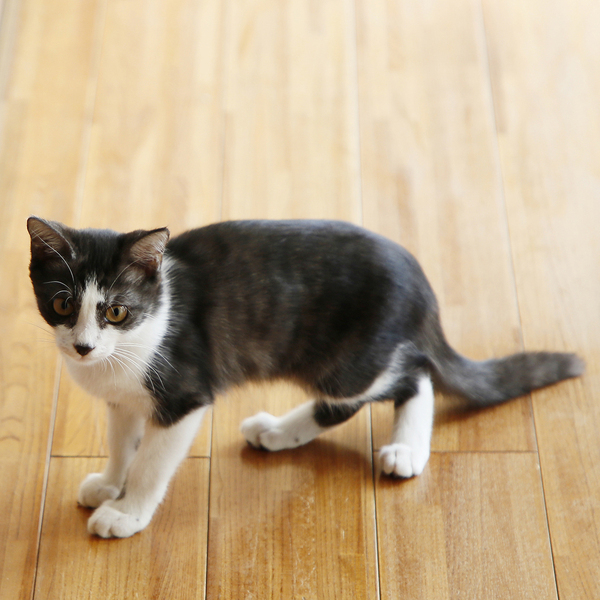 | 特徴(性格など) | 白黒のハチワレ。お鼻の黒柄がチャームポイント。シッポは縞々。シベリアンハスキーに似てる犬っぽい子です。 保護当時は、おとなしい印象の子で、保護して数日後に家の中で2日間行方不明になりました。冷蔵庫の裏に隠れており、ごはんもトイレも鳴くこともせず、ひとり耐久レースをしていました。 最初の頃に比べて、好奇心旺盛な子に育っています。引っ込み思案の性格のため、一進一退の挙動が多いです。 トイレは保護したその日のうちに覚えてくれたり、じっと様子を伺ったり、賢い子だと思います。爪研ぎはバリバリと張り切ってやってくれます。 ごはんをねだるとき、かまってほしいときは、ちゃんと自己主張して鳴く子です。それ以外、ほとんど鳴かない子です。 |