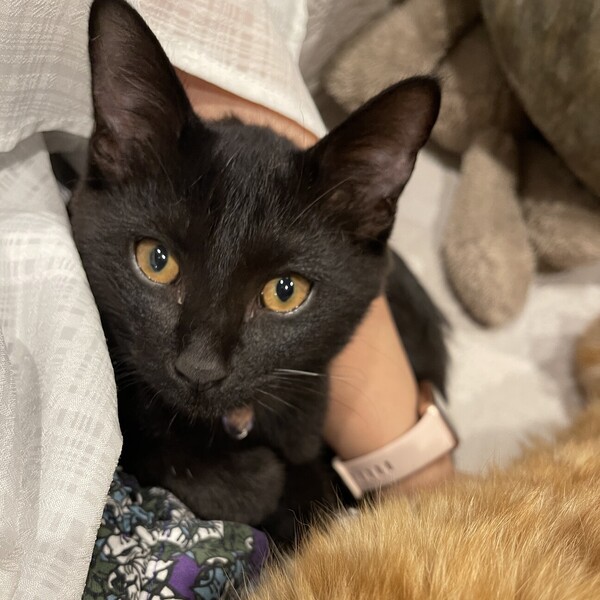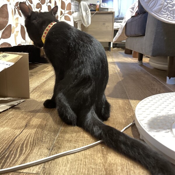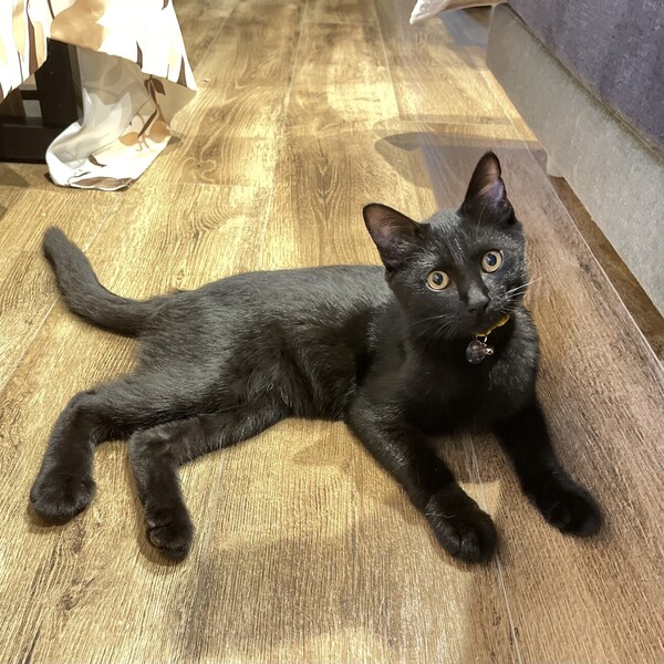 | 特徴(性格など) | ◾︎仮名:海人(かいと) ◾︎推定誕生日:2023年4月末~5月頭 ◾︎性別:男子 ◾︎猫種:日本猫MIX ◾︎毛色:黒(+脇と股にちょびちょびオシャレメッシュ白髪) ◾︎瞳の色:濃いイエロー ◾︎尻尾:すらりと細く、美しく、めちゃくちゃ長くてかっこいい! しなやかな長い手足、程よく筋肉質な胴体、健康的な肉体美の持ち主。お顔は普通~ ◾︎性格: ★人にも猫にもフレンドリー ★元気で朗らか ★綺麗好き ★遊び好き ★運動大好き ◾︎性格詳細: 愛嬌たっぷり人にも猫にも誰に対してもフレンドリーないいヤツ「海人」 来客にも物おじせず挨拶しに行く大物っぷりです。 とにかくやることがいちいちかわいい、コミュ力オバケです。 1ヶ月後輩の妹分をかわいがり、16歳爺さん猫や目の見えない3歳姉ちゃん猫とも力を加減して遊んでくれるようになりました。 寝てばかりの熟女猫には手を出さず、ただ寄り添って寝るという、相手に合わせた付き合い方ができているのには感心するばかり。 海人ならどこに出しても大丈夫!と仮家族みんなの太鼓判つき! おおらかな海人ですが、かなりきれい好きな一面も。 仮家族がネコトイレ掃除をしていると飛んできて、きれいになったトイレでもりもりうんこしっこして、これでもかこれでもかと砂を掻きまくります。 しっかり隠すを通り越して、むしろ掘り起こしているのはご愛嬌…… 魅惑のハイトーンヴォイスの持ち主。うなぁ~~んとかわいい声で鳴きながら寄ってきて、ぴとっと寄り添って来たり、膝に乗ってきたりするハイグレードな甘えん坊です。 保護宅の人間たち、毎日毎日「ほんとに海人はかわいいヤツだなあ・・・」とデレデレしております。 元気なお子様のいるご家庭、先住猫さんのいるご家庭も、海人ならきっと大丈夫!(先住猫さんがウザがる可能性はあります) いかにも黒猫らしいアスリート系のしっかりとした体の持ち主であることに加え、生後4カ月という毎日大運動会開催中のパワフルな月齢ですので、 ★やかましく走り回ってもおおらかに見守っていただけるご家庭 ★なんなら子猫と一緒に猫オモチャ振りながら走り回って下さる里親様 ★できることなら年の近い若い先住猫さんのいるご家庭 等にオススメです! 猫初めてさんは、海人の素晴らしい身体能力と遊び盛りの月齢ゆえの激しい運動会開催にご覚悟をお願いします。(まぁ、子猫とは激しく走り回るものですヨ) ※「おっとりおとなしい猫をお膝でナデナデしながら、穏やかに流れる時間を過ごしたい・・・」というご家庭には全くお勧めできません。子猫は諦めて大人の猫をお迎えされることをお勧めします。 我々仮家族を笑顔にしてくれる海人を、家族として一生涯大切にしてくださるファミリーをお待ちしております! ============================ 健康状態 ■検便後、駆虫・予防薬投与済 ■エイズ・白血病(-) ■三種混合ワクチン2回済 ■去勢手術済 健康花丸(^^) 好き嫌いなくご飯をもりもり食べ、毎日良いウンチをし、良く運動し、よく眠り、健やかでしなやかで美しい肉体の健康優良児です♪ 心身共に健やかで、大変飼いやすい子と言えます。 保護時から獣医さんの手当をきちんと受け、良いご飯を食べさせ、しっかり健康管理をしておりますので、安心してお迎え頂けます。 |