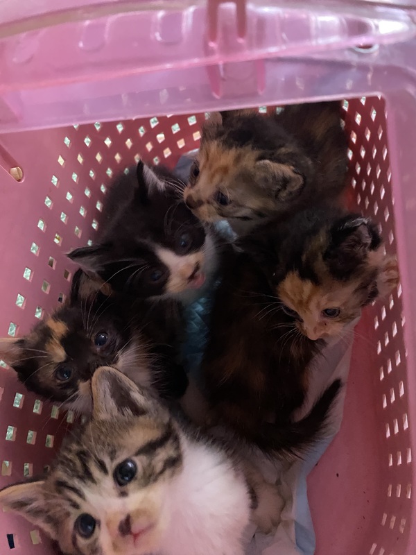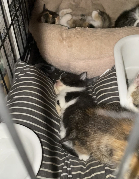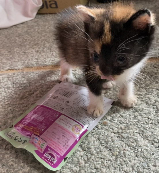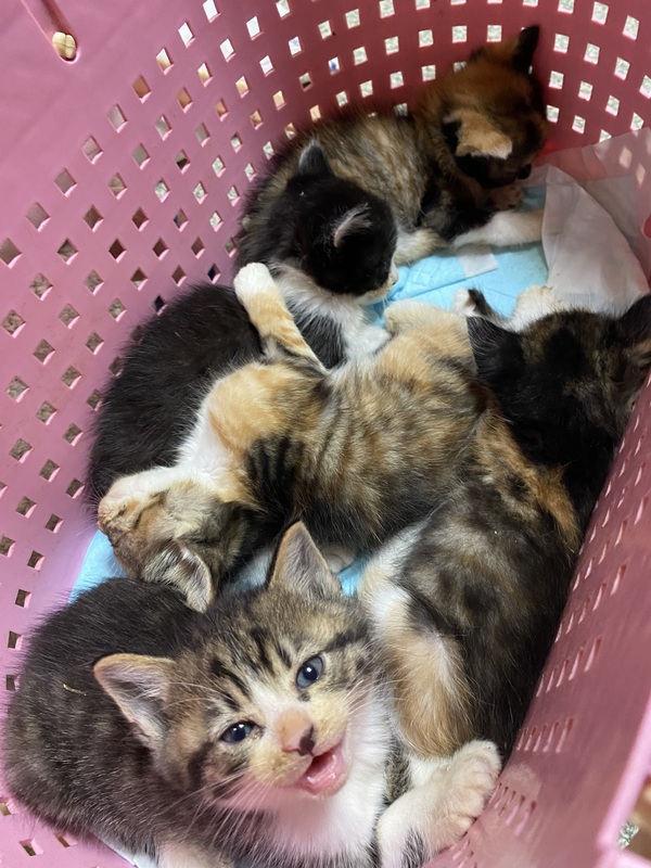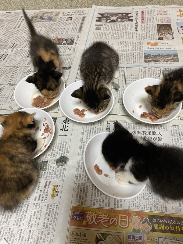 | 特徴(性格など) | 子猫6兄妹、獣医さんいわく推定1ヶ月です。 ・キジトラ白1匹(オス)食欲旺盛、わんぱく ・三毛猫3匹(メス)好奇心旺盛 ・ハチワレ1匹(メス)膝の上大好き |