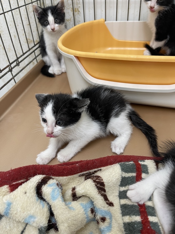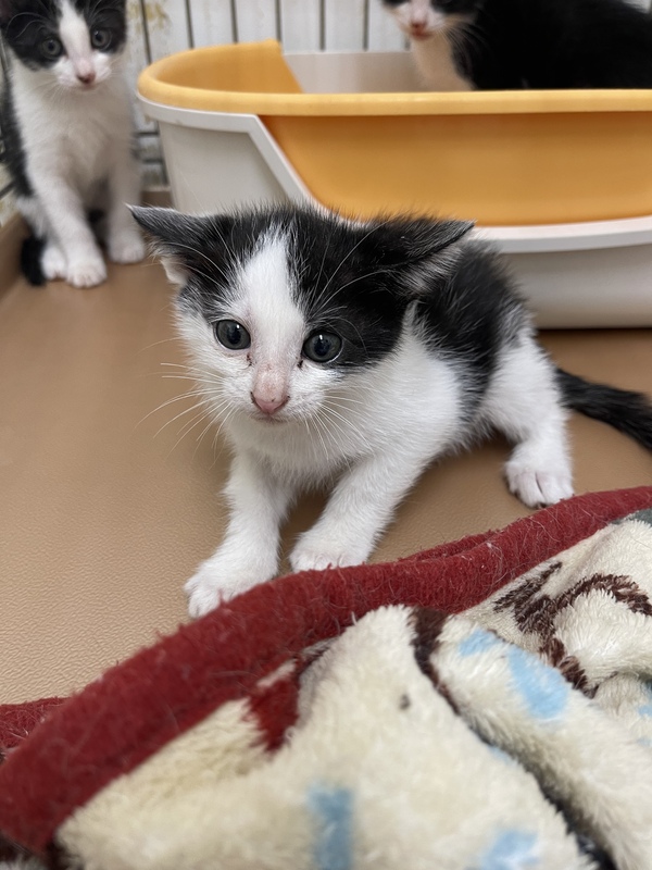 | 特徴(性格など) | ハチワレ4兄弟で保護されました! お顔 白黒の7:3ハチワレ からだ お腹白、背中くろ 7:3分けのハチワレちゃん。 元気いっぱいでもぐもぐご飯をたべまくり、兄弟と遊んでいます。 ワクチン摂取後開始予定です! |