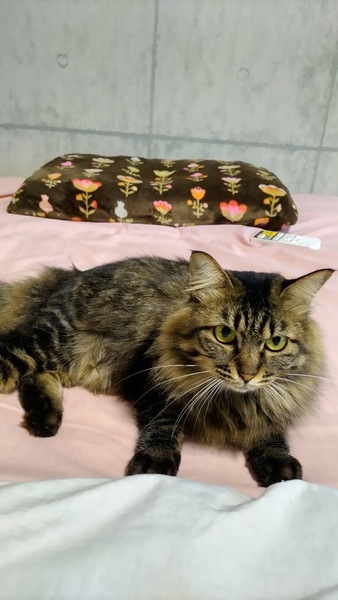 | 特徴(性格など) | 怖がり、警戒心強く人を怖がりますが、猫たちとは仲良しです。 一緒に暮らしてる猫ちゃんと嬉しそうに尻尾を立てて運動会をします。 運動神経よし。胴長短足気味の半長毛さんです。もふもふです。 チュールは指から食べます。ブラッシングもおとなしくさせてくれます。 |
