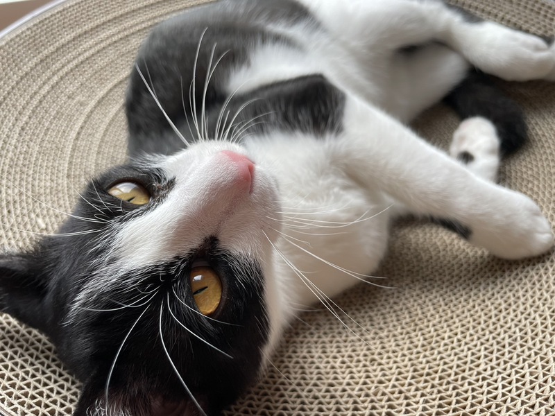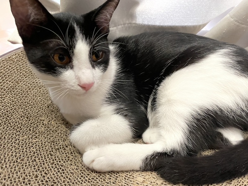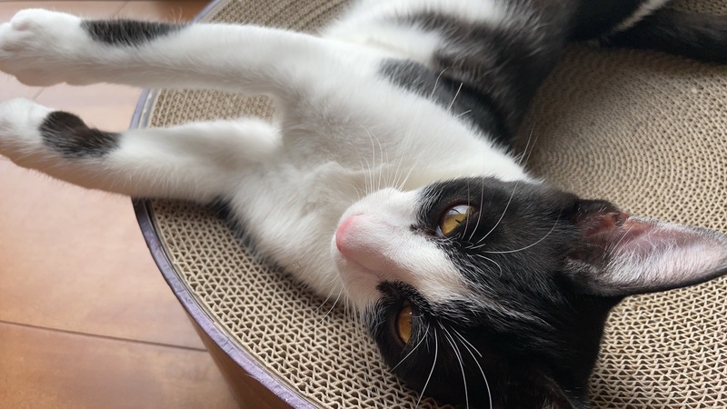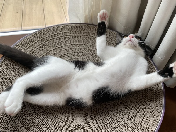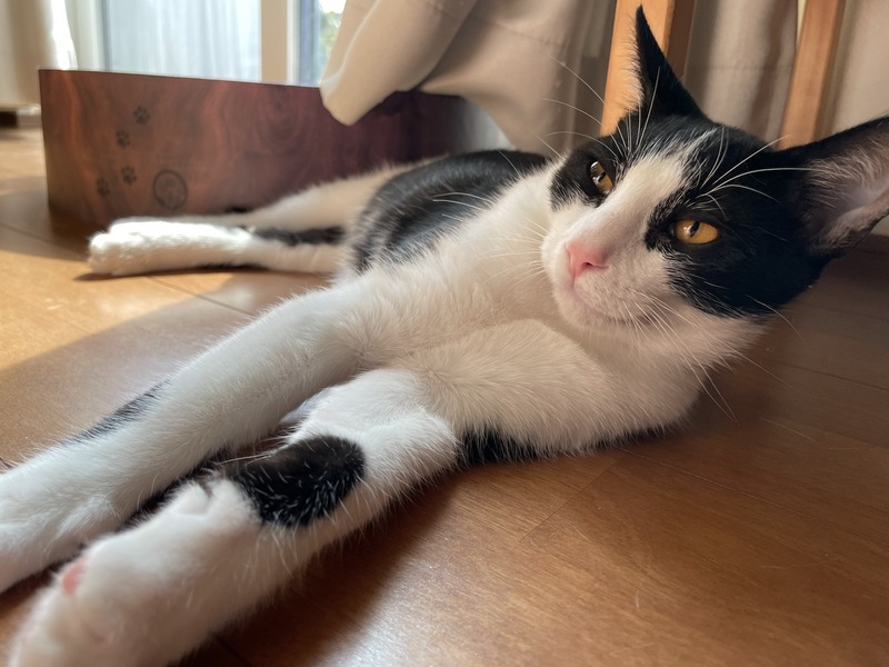 | 特徴(性格など) | 保護して1日目はおとなしく、人馴れしていないのかなと思いましたが、翌日から、ゴロゴロ言って、撫でさせてくれました。今では、人の後ろをついて歩いてくるし、たくさん触らせてくれて、にゃーんと鳴いてお話してくれて、ずっとゴロゴロ言っています。お外の世界の警戒心は忘れてしまったようで、へそ天バンザイポーズで爆睡していて、見ているだけで癒してくれるいい子です。 我が家の先住猫には、遊んであそんで〜と寄っていき、時々、猫パンチされていますが、へこたれません。先住猫がいるおうちなら、留守の時間が長くても大丈夫だと思います。 |