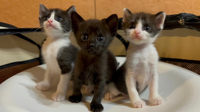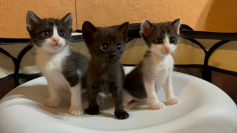 | 特徴(性格など) | 仮名げっぱく ハチワレ黒白 男の子 仮名きなり チャコールグレー✖️白女の子 仮名あい 黒 女の子 |