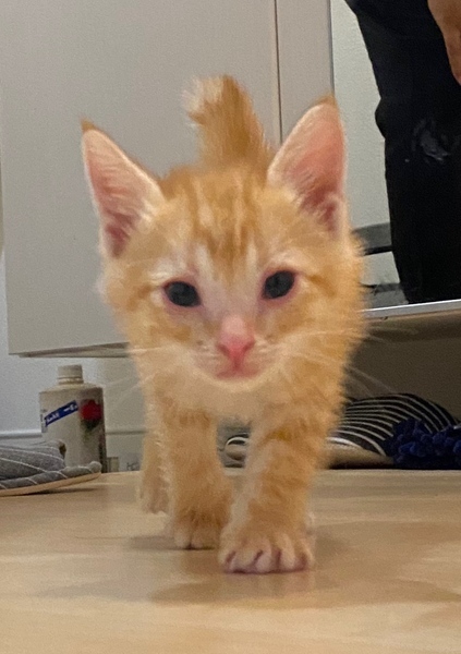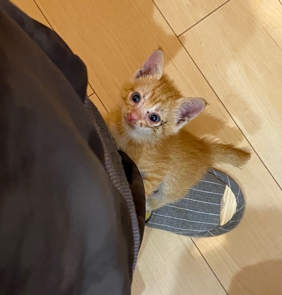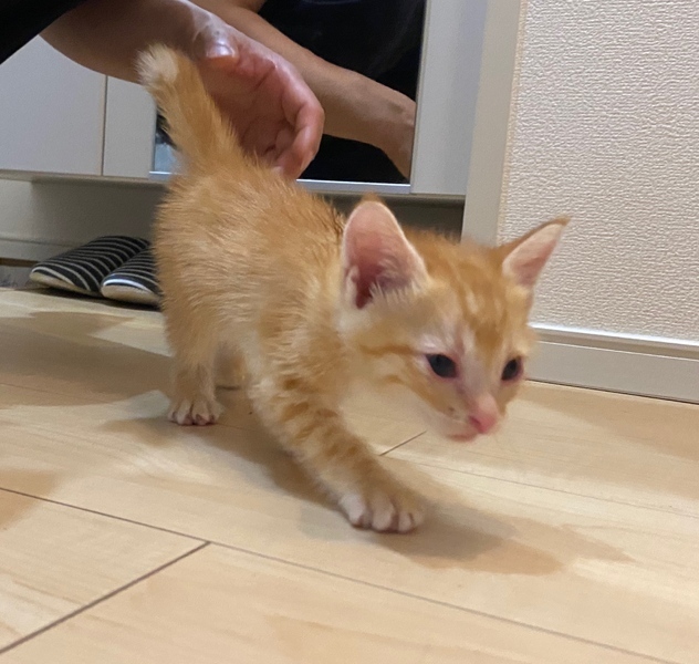 | 特徴(性格など) | 雑種の茶トラ しっぽの先が白いです。 小さいですが、歩くのはかなり速いです。 隔離部屋内で探検したり、ボールで遊んだり元気いっぱいです。 すぐ人間をよじ登ってきたり、脚でふみふみしたり、触るとゴロゴロと喉を鳴らすので、かなり甘えん坊です。 |