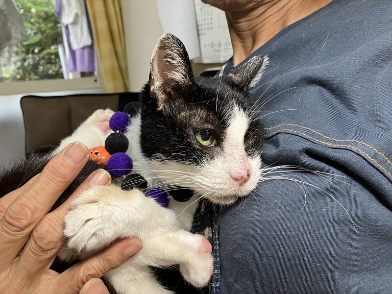 | 特徴(性格など) | 物静かで抱かれると安心していつまでもじっとしています。一緒にベッドで添い寝が大好き。 慣れやすいので飼いやすいと思います。 6年ほど外猫暮らしをしていました。 片目は古い傷で失明していますが専門医の診察でインターフェロン入り点眼剤を2週間で完了。 |