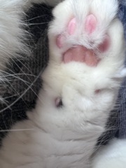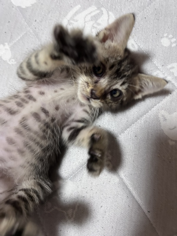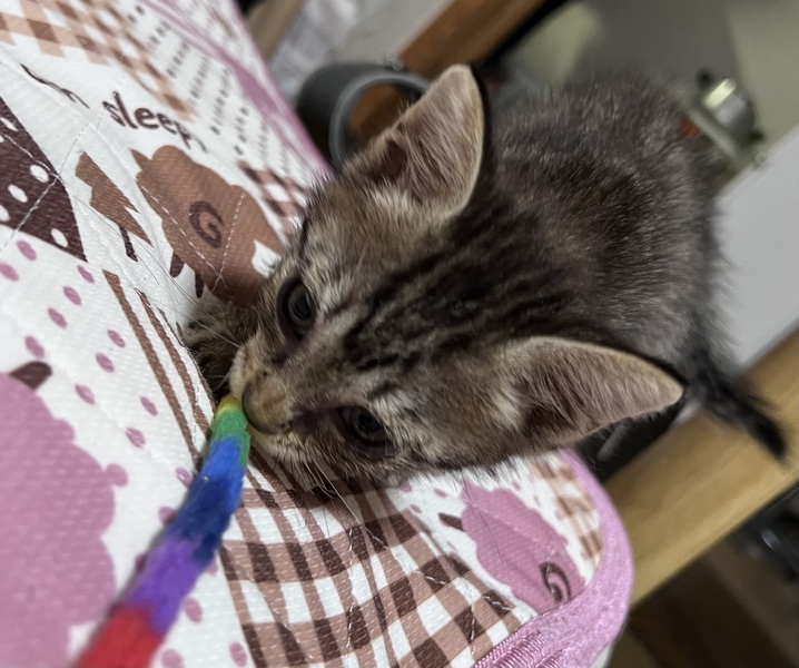 | 特徴(性格など) | おもちゃで遊ぶのが大好きな元気いっぱいの男の子です!! ネズミさんや小さなボールでひとり遊びもするくらいおもちゃが大好きです! 人懐っこくスリスリしたり、ゴロゴロ喉を鳴らしながらふみふみします。触るとおしりを上げて喜んでくれます! お写真がブレてしまい綺麗に撮れないほど元気に遊び回っています! |