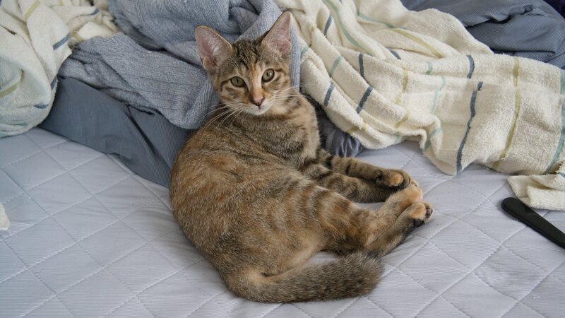 | 特徴(性格など) | 雑種キジトラの女の子です。ちょっと茶色っぽいです。 2023年6月中旬生まれです。 里親募集中の4つ子の中の1匹です。 しっぽが短くて先がカギしっぽです。 産まれたときから室内飼いで人に慣れていますが抱っこはあまり喜びません。 食欲旺盛で活発で人懐っこいです。 身のこなしが軽く運動神経がよいです。 ねこじゃらし大好きで布切れが大好きないたずらっ子です。 |
