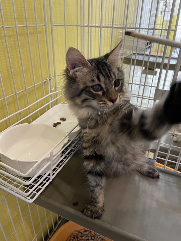 | 特徴(性格など) | もふもふのキジトラ長毛の女の子です! しっぽは長くてまっすぐ。 背中は細かいトラ柄、足は太めの黒ラインが入っています。 まだすこし人を怖がっていますが、だいぶ慣れてきたので時間の問題で甘えん坊さんになりそうな予感がします! 健康状態に現在問題はありませんが右目の視力が弱いです。 生活する上では全く問題ありません。 遊ぶのがだいすき!! 優しくてもふもふしたい里親さん、お待ちしています! 営業時間中、いつでも面会可能です! |