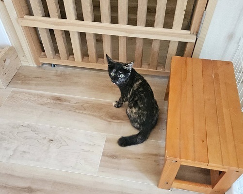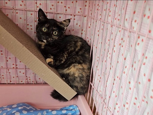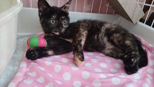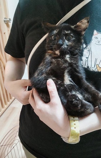 | 特徴(性格など) | 撫でるとゴロゴロ、抱っこしてもゴロゴロと喉を鳴らして甘えます。 目が丸くて、綺麗な毛色、黒サビの女の子です 猫との生活が初めての方にもお薦めです |