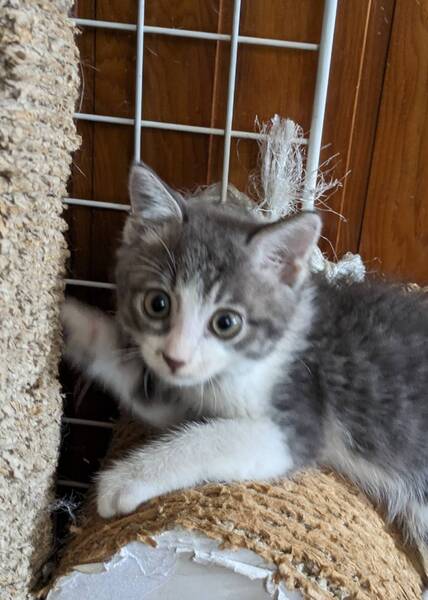| 特徴(性格など) | 最初から人見知りがなく、やんちゃで大きな猫も怖がらず向かっていく怖いものしらず。 チャコールグレーのとても珍しい色合いの毛色。 尻尾は曲がり尻尾/ フードを開ける音に反応し、真っ先にきて、人を押しのけてたべる。食欲旺盛で元気いっぱい。 |