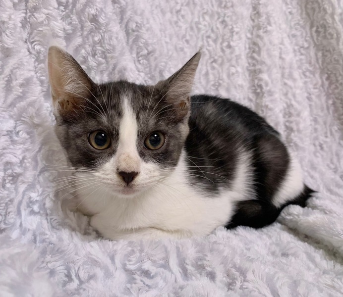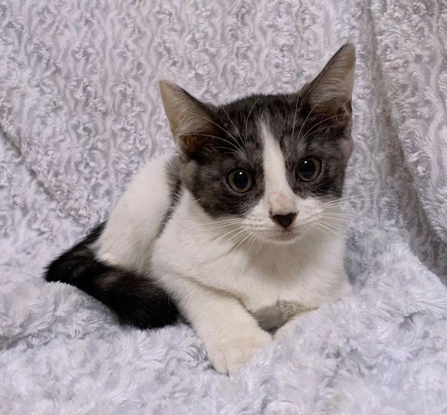 | 特徴(性格など) | 【仮名】紋黄ちゃん 【性格】シルバーのまだら模様がカッコ可愛いモンキちゃん♪ ただの黒白ハチワレじゃないよ! ぴょんぴょん飛び回って?逃げ回って? まるでおサルさんみたいなので紋黄=モンキーちゃんです♪ でもそれは最初のお話。 今は預かりさんのお陰で抱っこ大好き 背中にもヨジヨジ上るベタ馴れちゃんに変身しました! まだまだ色々学習中なので姉妹の紋白ちゃんと ペアでのお迎えを希望します♪ ※1ピキ譲渡不可 |