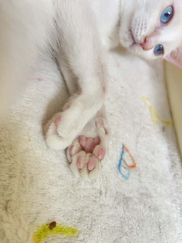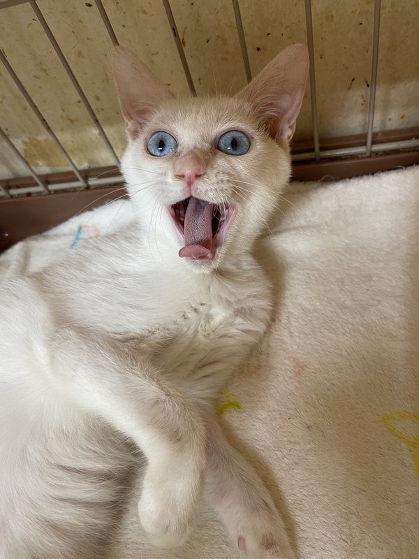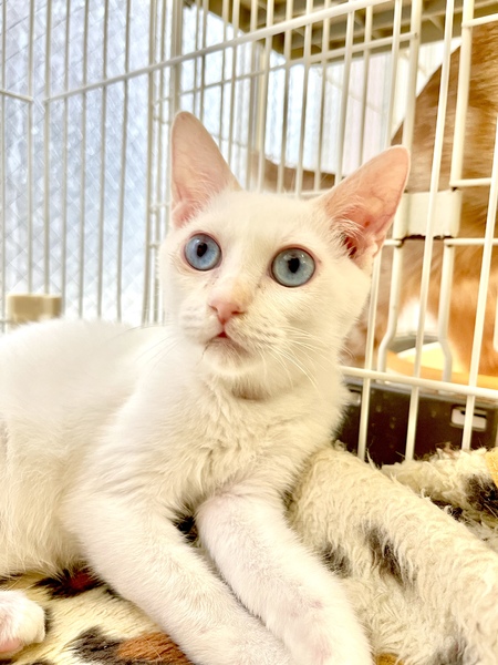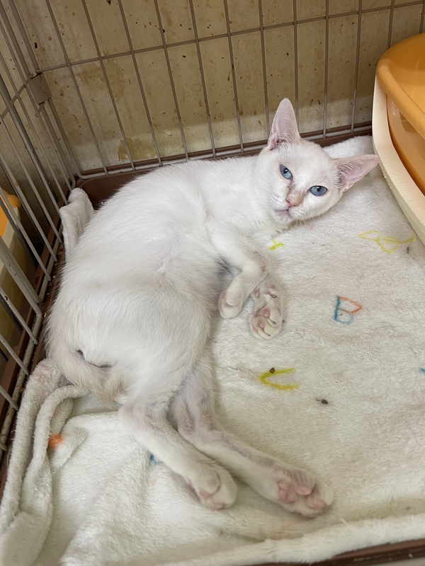 | 特徴(性格など) | 青い目がとってもきれいな男の子です! 人間にまだちょっとびびってますが、最初よりかなり慣れたので今後甘えん坊さんになる可能性ありです! なでなでは余裕でできますー! 猫同士も良好です。 青目の白猫は人気も高いのでお早めにご連絡ください。 営業時間中、いつでも面会可能です! |