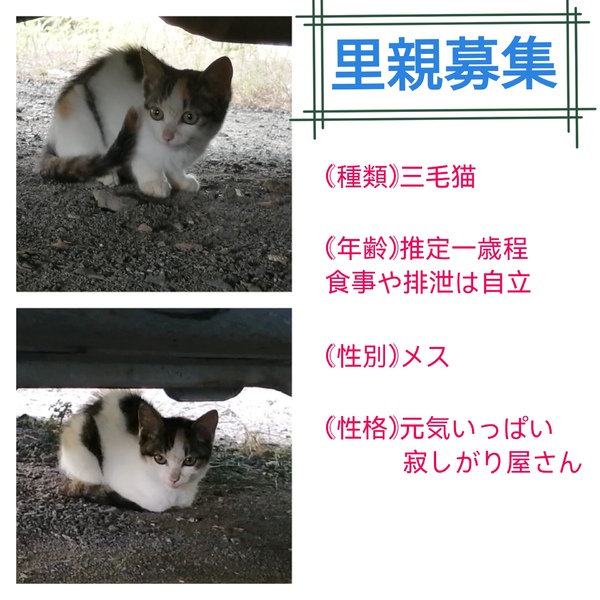 | 里親募集する理由 | 庭に住み着いて一週間程経ちます。 親猫がいる様子はなく、飼い主も見当たりません。 お腹をすかせ鳴いていたため保護しました。 先住猫がいるため、飼育することができません。 どなたか大切に育ててくれる方を探してます。 |