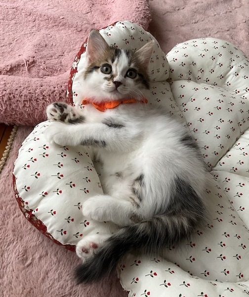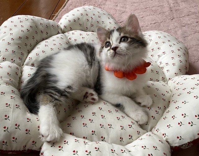 | 特徴(性格など) | ☆☆☆ご希望の方は、以下のアンケートフォームにご記入の上、送信してください☆☆☆ ねこ親希望アンケート→ http://chibawan.net/contactform_cat 【猫No】3723 【愛称】桃太郎 【性別】オス 【年齢】推定8週(23/08/05頃生) 【毛色】キジ白・真っ直ぐの長しっぽ 【体重】951g(23/09/30現在) 【状態】ノミダニ駆除済、駆虫済、ワクチン1回接種済(23/09/16)、血液検査済(猫エイズ(ー)・白血病(ー)) 【保護場所】野田市 【日記】23/08/19〜09/24 https://www.instagram.com/iizukamisae/ Instagram @iizukamisae 23/09/24〜 http://instagram.com/kemikemi1206 Instagram @kemikemi1206 【経緯】柏市動物愛護ふれあいセンターより引き出し、離乳までミルクボランティアさんに大切に育てていただきました。 【性格】洋猫の血が入っていると思わせる、半長毛でまふもふの被毛がゴージャスな、キジ白ハチワレの男の子です。 将来長毛に育つかもしれません。 被毛は柔らかくふわふわでボリュームがあり、いつまで撫でていても飽きません。 大きくつぶらな瞳と、白と濃茶のコントラストが美しい、独特なお顔の模様も印象的です。 甘えん坊で、座っているとお膝や肩に乗ってきて、喜んで喉を鳴らします。 子猫らしく元気で活発、目につくものはなんでもおもちゃにして楽しそうに遊んでいます。 生まれた時からずっと一緒に育ってきた、兄弟の金太郎が良き遊び相手となっておりますので、金太郎と一緒に迎えて下さるか、遊び相手となる若猫の先住さんのいるご家庭を希望します。 育ち盛りの桃太郎の日々の様子や、育児日記の悲喜こもごもなどをインスタグラムに毎日アップしています。 子猫との生活がどんなものか、また、桃太郎の性格なども垣間見えるかと思いますので、ぜひご覧下さい。 【補足事項】お届けは、去勢手術・マイクロチップ装着などの医療処置が終わってからを予定しています(10月12日に手術を受ける予定です) 【その他】完全室内飼育で終生愛情を持って桃太郎と暮らしていただける方、脱走対策を労を惜しまず入念に施して下さる方、定期的なワクチン接種や、その時々において必要な医療処置等の健康管理を約束していただける方からのお問い合わせをお待ちしております。 可愛い桃太郎に会いに、預かり宅までいらして下さい! ※ 大変申し訳ないのですが、猫が幼齢のため、55歳以上の方からのお申し込みはお断りする場合がございます。 ※ 猫との暮らしが初めてのお子さまには、アレルギー検査をお勧めしております。(短時間猫と触れ合った経験だけではアレルギーの有無はわかりません) 責任ある終生飼育には必要なことですので、ご理解下さいませ。 |