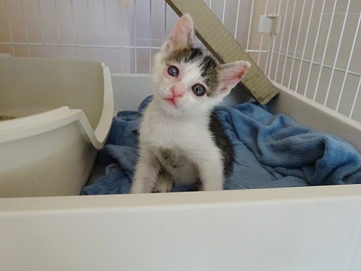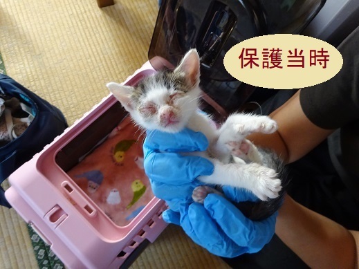 | 特徴(性格など) | 甘えん坊な女の子。 保護時、風邪をひいて目ヤニで目がふさがっていました。 白濁していた右目は、抗生剤と目薬によって綺麗になってきました。 風邪が治って元気になってきて、なかなかのオテンバちゃんになりそうそうです。 とても人馴れしていますので、猫が初めての方にもお薦めです。 |