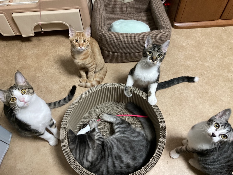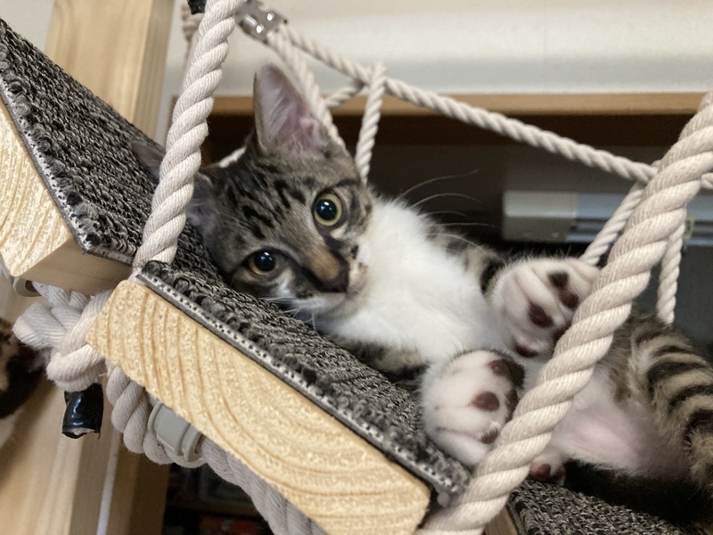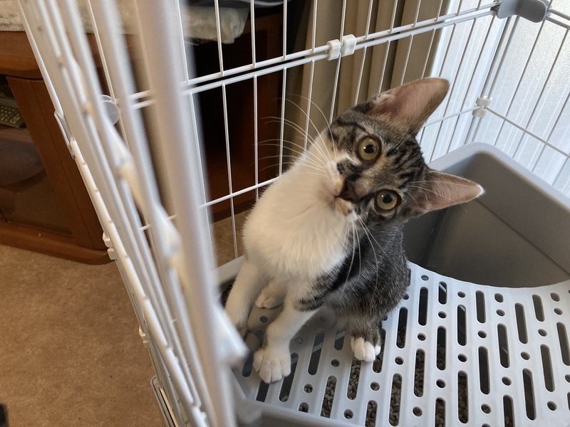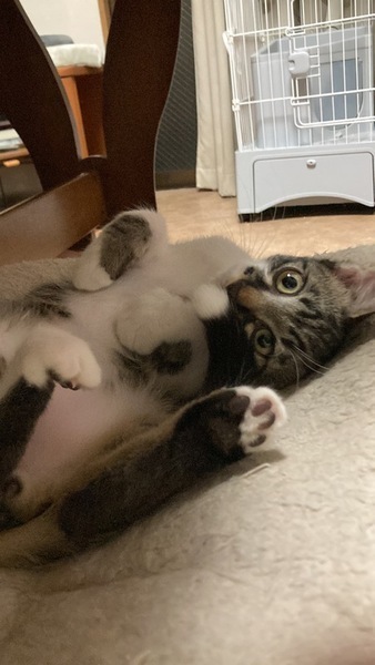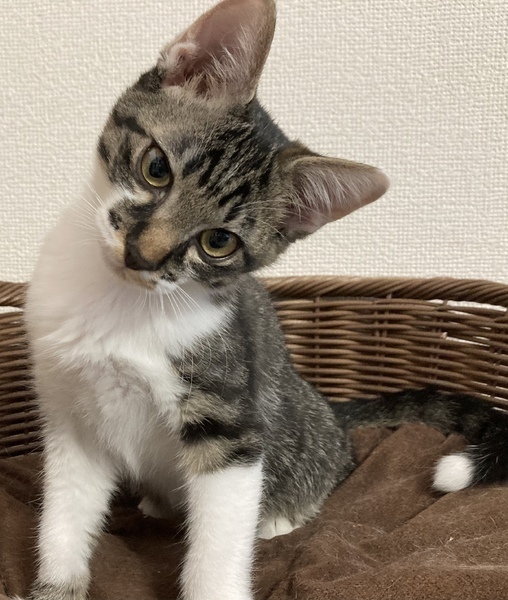 | 特徴(性格など) | キジ、耳としっぽの先が白いです。 口にブチあり。 見た目はキリッとしてクールに見えますが、ク〜ッと高めに鳴き、なでなでして〜とばかりコテンと転がります。 呼ぶとお返事してくれます。 抱っこより背中カキカキが大好き! 首をかしげるポーズがキュートで癒されます♪ 食欲も旺盛で、元気にゴハン催促してくれます。 |