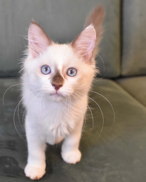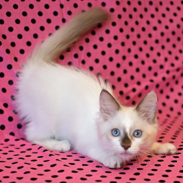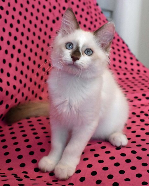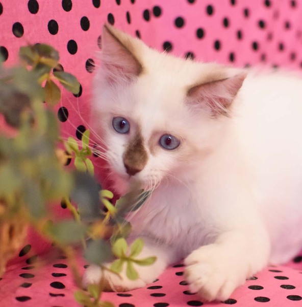 | 特徴(性格など) | 【仮称】シオンちゃん とても柔らかく肌障りの良いふわふわなシオンちゃん。瞳は美しい海の色です。 ラグドール系のため少しずつ色が出てきて、ますます美しい猫に成長しました。 見かけの気品ある姿とは裏腹に、性格は好奇心旺盛、天真爛漫です。 運動能力も高く、子猫らしく走り回って遊んでいますが、最近は少し落ち着きも出て来ました。 目が開く前から人の手で育てられたので人馴れは問題無く、信頼を寄せてくれます。 初めての人や環境にもすぐに適応できる子です。撫でるとゴロゴロと喉を鳴らして、すりすりしてきます。 食事はドライフードと缶詰を1日4回です。 現在少し甘噛みがあり、爪の出し入れが下手ですので、小学生以下のお子様のいらっしゃらないご家庭に向いています。 複数の猫と一緒に過ごしていますので1匹だけでのお留守番が短く、50代までの女性がお世話出来るご家庭にお願いしたいと思います。 将来は毛足が長くなる可能性が高いので、長毛の猫のお世話について事前にお調べください。 たばこの副流煙は猫のリンパ腫の発症率を高めますので、ご家族に喫煙者のいないご家庭を希望します。 |