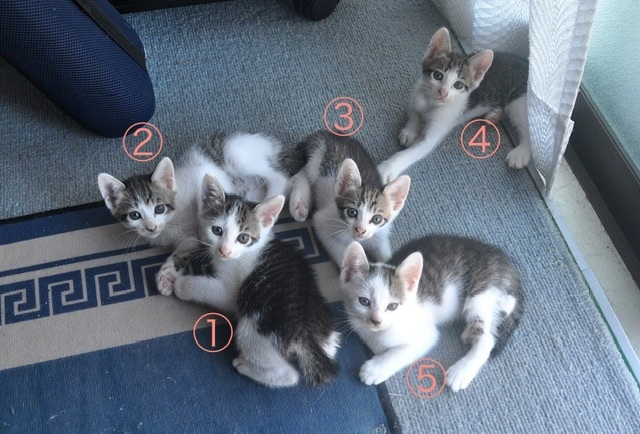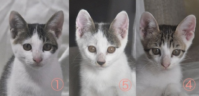 | 里親募集する理由 | 父宅に野良猫がご飯を食べに来るようになり、お腹が大きかったため病気なのではと心配していたところ、少し経ってから子猫を連れて来たそうです。 他にも保護猫や野良猫の面倒をみており、これ以上の支援が経済的、環境的に難しい状況です。 責任を持って可愛がって下さる里親さんに出会って欲しく、こちらに応募させていただきました。 ※現在募集している仔猫は、①⑤④の仔猫です。 模様の判別が難しく、先日誤って募集中の子を募集終了と記載してしまいました。 再度ご確認をお願いいたします。 |