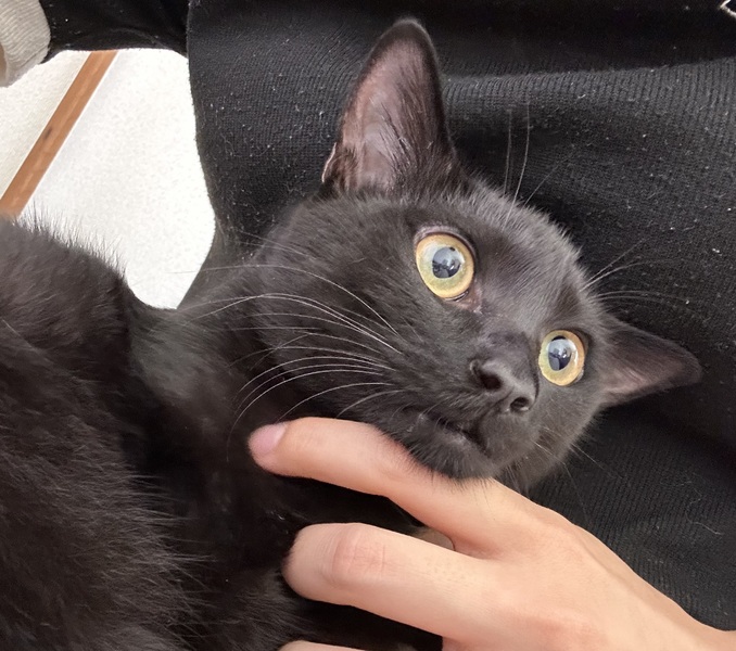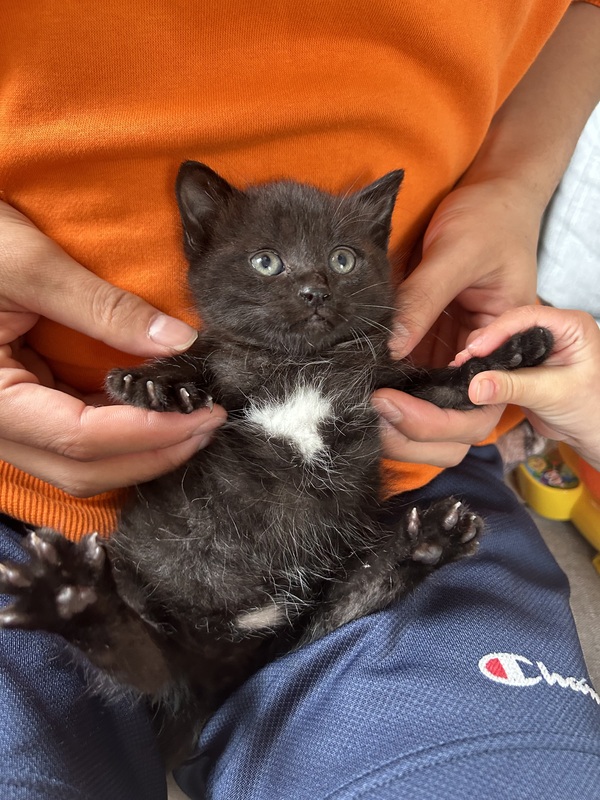 | 特徴(性格など) | 黒猫ですが、お腹に白い模様があります。かぎしっぽです。すごく甘えん坊で、遊ぶのが大好きです。基本的には後ろを着いてきますが、スイッチが入ると手や足を狙ってきます…。噛むこともあります。 | ||