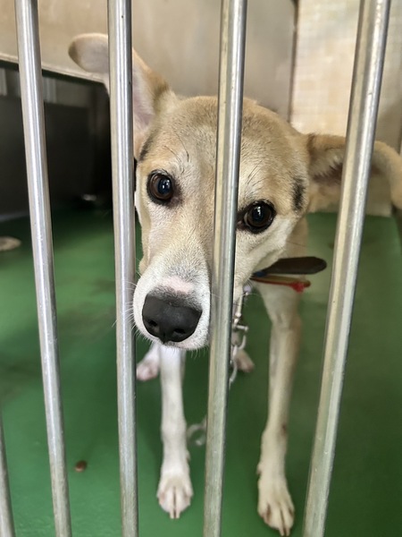 | 特徴(性格など) | ♡人が大好きなとっても可愛い甘えん坊男の子。推定になりますがあどけなくまだ若くて3歳位?小柄な中型で体重は10キロちょっと位に見受けられますฅ•ﻌ•ฅ 明るくて元気はつらつ、わちゃわちゃしてます(^^) 尻尾フリフリとびきり人懐こく他犬に対してもフレンドリーな性格花丸君です♡ 誰が何処を触っても大丈夫、遊んでほしくてかまってほしくて擦り寄って甘えてきて本当に可愛いです(^^)お子ちゃまパワー全開♪といった感じで興奮して遊びに夢中になったり、犬舎に入りたくない時には甘噛みしたりします、元気に飛びついてきたりもします。(本人は陽気で遊び、甘えのつもりです(^^;; ) 無駄吠えしたりせず、他犬にも仲良く挨拶しています。お座りやマテ、お手などは何も知らないようです。 ◎痩せ気味です。今は毎日2回、ご寄付で送って頂いた栄養価の高い良質なドライフード(ネイティブドッグフード)とデビフ缶詰を食べさせています。 ずっと外で生活してきて可哀想に爪も伸びています。 綺麗にブラッシング、シャンプーをして栄養をつけたらもっと凛々しい美犬クンになる事でしょう(^O^)/ 職員さんが連れ出してくれるお散歩も、嬉しくて楽しそう♪出だしは引っ張りますが興奮がおさまれば落ち着いて普通にお散歩出来ます、小ぶりですし問題無く制御出来る程度です。 ※ですが、急な物音や知らない場所にビックリして怖がって、咄嗟に逃げようとする可能性も大いにあり得る事だと思いますし、その時の力、引きの強さも想定し、突然の走り出しや高い塀や壁・柵の飛び越え・急な方向転換や首を振って後退りからの首輪抜け、胴輪抜けにはご用心です!! まだ呼び戻しも覚えていないので、もし逃がしてしまったらピューっと走って行ってしまうタイプかもしれません!(>_<) もし逃がしたらもう捕まえられない!というようにお考えくださいm(_ _)m ※繰り返しになりますがどんな子であっても、慣れてきても、常に、脱走・逃走には充分な注意と最大限の配慮をお願いしております! この子のペースや体力をみながら、毎日朝晩のお散歩、必要な運動の時間をしっかり取ることの出来るご家庭、 譲渡後には早急な病院受診が可能なご家庭を希望しておりますm(_ _)m 人間が焦らずにゆっくり見守りながら、愛情を持って接し、しっかりとお散歩にも連れ出して行けば、この子ならきっと新しい家庭に馴染んでいけると、ただ思い切り甘えて目一杯遊んでほしいのだと思います。 辛かった過去があるという点も踏まえ、人は怖くないんだよと、ずっと人を信じてくれる様に、広い心でドンとこい^_^と仰って頂ける方、この子をこの先も尻尾フリフリ♪で、ニコニコの笑顔にしてくださる方、いらっしゃいませんか? どうぞ宜しくお願い申し上げますm(_ _)m ♡今後の健康の為にも、引き続き良質なフードを与える事が可能な方。 ⭐️必ず室内飼育で、譲渡後速やかに病院受診、健康診断、(血液検査、尿便検査、ノミダニ・フィラリア予防や爪切り、シャンプー等)混合ワクチン、去勢手術をする事が可能な、なるべくお留守番が少ない、沢山優しくスキンシップやコミュニケーションで触れ合っていただけるご家庭。 ⭐️ フィラリア予防実績、混合ワクチン接種歴はありません。 フィラリア陽性の可能性も有り得る事となります(>_<) ⭐️室内でのトイレの躾も1からとなります。 未去勢で片足を上げて排尿します。(今のところトイレは外でしたがりお散歩まで我慢しています) 何かと手がかかり大変ですが(広めのL字型 トイレスペースやペットシート、マナーベルトを用意など)覚悟と根気・理解で受け入れて下さる方m(_ _)m ※譲渡後はお早めの健康診断、去勢手術、その際に歯石が有れば除去も一緒にお願いしますm(_ _)m ⭐️出来れば中型〜大型犬の飼育経験があり、やんちゃなお子ちゃまワンコを育てる自信のある方。 叩いたりせず、愛情を持って接することが出来る方。 ⭐️躾、毎日朝晩のお散歩や運動、スキンシップやコミュニケーションに充分時間をあてられる方。 今後場合により、トレーナーさんに依頼やトレーニング教室等も視野に入れて犬の為にも、里親様ご家族の為にも、しっかり学びながら向き合い考え、対応してくださる方。 何卒宜しくお願い致しますm(_ _)m 以上の点を踏まえ、この子が置かれている状況、寂しかった、傷ついているであろう心をご理解の上、全て受け入れ、寄り添いながら愛情を注いでくださるご家庭で可愛がっていただきたいと願っております。 保健所収容された全ての子達は身勝手な人間による被害者であり、何も悪くありません( ; ; ) 家族の一員として生涯大切にしてくださる優しいご家庭とのご縁が結ばれ、お散歩から戻っても嫌な檻の中では無い、家族の皆さんとずっと一緒に居られるお家、厳しい暑さや寒さにも、もう安心して快適に過ごせるお家が見つかりますように☆⭐︎♡♡ この子は飼育放棄されるなんて思いもせずに今まで人間を信じて
