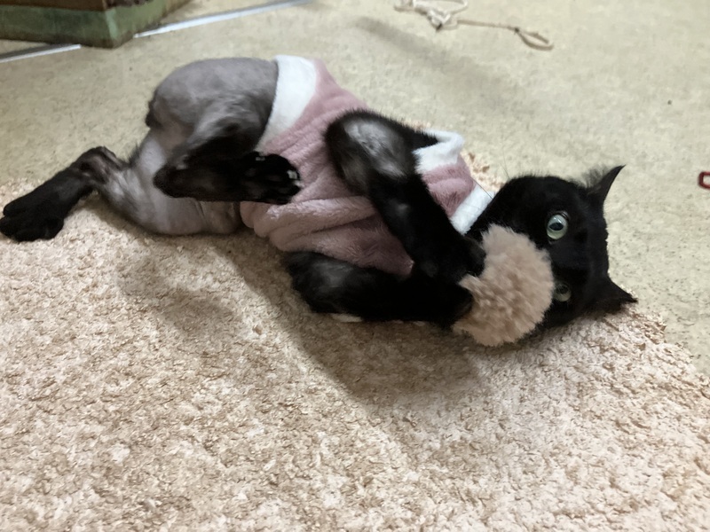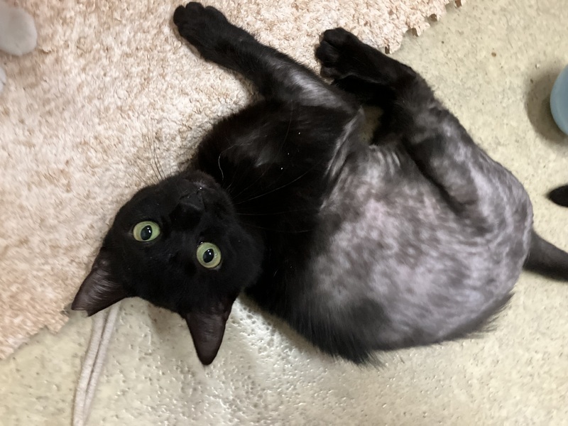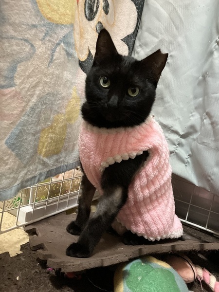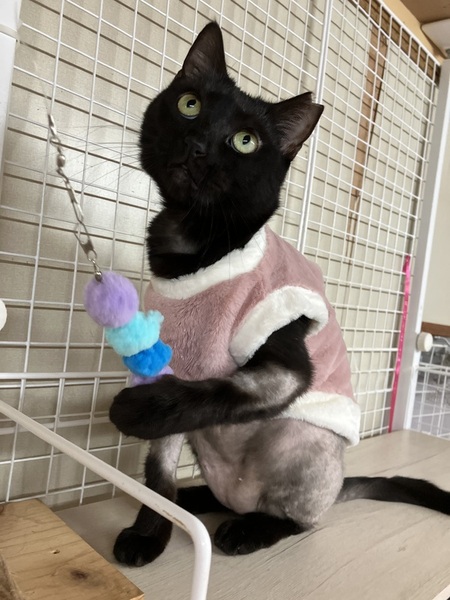 | 特徴(性格など) | ききちゃんは黒猫の年齢は2歳半前後かなと思われる、とっても可愛らしいお顔立ちで、ぬいぐるみみたいなフォルムや雰囲気もある女の子です。 純朴で、ゆったりしていて、マイペースで、無邪気な所がとっても可愛いです。 鳴き方もにゃーとは鳴かず、表現は難しいですが、キュルルル⤴︎とかヒュルルル⤴︎とか独り言見たいな可愛い甘えた声で鳴くんです。だからこちらも思わず同じような感じで、ぅん〜ん⤴︎?な〜に?って感じで返したくなるんです。 1番人懐っこくて、初めての人にも動じずマイペースに過ごし、すぐに慣れて近くに寄って来て、ナデナデしてもらったり遊んでもらったりしています。 ききちゃんは現在、てんかんという病気でもあります。薬を毎日服用して症状は出なくなっています。 あと、過剰グルーミングにより毛が薄くなってしまい、原因はハッキリとわかっておらず、出来る治療をいくつかしてみて現在は症状も落ち着き、毛も少しずつ生えてきているところではあります。 てんかんでも毛が無くてもやっぱり可愛いききちゃんなんです。 てんかん持ちとは思えないくらい最近は本当に元気よく遊び回ったり、玉取りしたり、無邪気に過ごしてくれてる姿に癒されております。気も強い所もあり、遊んでるのを他の子が邪魔すると、怒って、猫パンチや小さくジャンプして「こらっ!」って感じの動きをするんですが、力の弱い子猫がやってるみたいでまた可愛いんですね〜。 日向ぼっこしての〜んびり寝てたりもして、マイペースに楽しく過ごせているようです。 ご飯もちゃんと食べていて、以前は少しずつ食べていた為、食べ終わるのが遅い方で、最後まで食べず後からまた食べる事が多いでしたが、最近はほぼ1度で完食してくれています。ご飯の準備の時に待ちきれず、お手手がお皿の上に乗ってくるのがまた可愛いんですね〜。 あと、寝る時私が寝てる近くに来ます。私のお腹の上で寝たり、私の腕の中で寝たり、何かしら私の側に来てくれて、ちょこんと体を小さく丸めてる姿やクリクリお目目でぽーっとしてるところもまたとっても可愛いです。 ブラッシングも好きで、特に顎下をしてあげると、目を細めて「気持ちいい〜」って表情をしてくれて、普通は途中で顎を引いて終わろうとするのですが、ききちゃんはずーっと顎を出していて、いつまでもブラッシングされていたいという感じなんです。その気持ちよさそうな表情もとっても可愛いです。 とにかく全部が可愛くて、子猫ではないんだけど、あどけない可愛さを持ってるききちゃんに、きっと貴方様も夢中になってしまうのではないかと思いますよ。 そんなききちゃんの可愛さに気付いてくれて、家族に迎え入れたいと思ってくださる素敵なご家族さんが現れてくれたらいいなと思っております。 ききちゃんが安心していつでも家族に甘えられて、のほほんと楽しく幸せに暮らせて、た〜くさん可愛がってもらえて、ききちゃんの状況も十分理解してくれて、温かく迎え入れてくださる心優しい素敵なご家族さんに出会える事を心より願い、お待ちしております。 どうかキキちゃんを何卒、宜しくお願い致します。 |