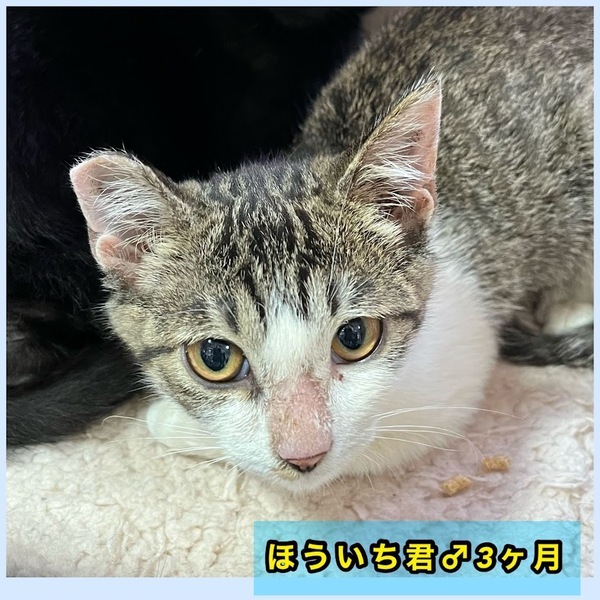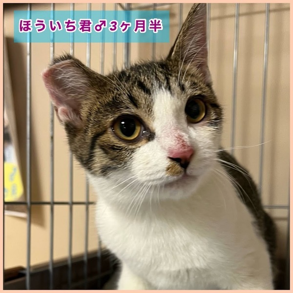 | 特徴(性格など) | 車のボンネットの中に入り込んでいました。 運転中もボンネットの中にいたのか、耳は切れており、顔は擦り傷だらけで真っ黒でしたが、何とか生きて保護され、病院での治療を終えました。 最初だけ人見知りしますが慣れると甘えん坊の構ってちゃんです。 1個別お見合いにも対応します。 ノミダニ駆除、検便済み。 エイズと白血病の血液検査陰性。 ワクチン2回済み。 去勢も済ませました。 動画は後から出てくるのがほういちくんです、 |
