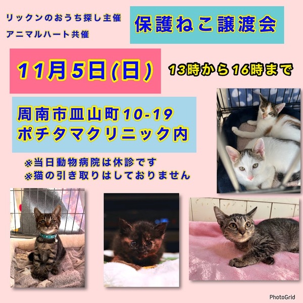 | その他(譲渡条件など) | 【猫の里親を希望される方は、以下の譲渡条件のご確認をお願いいたします】 ●終生、責任と愛情を持って、大事な家族として育てて頂けるようお願いします。 ●一戸建て住宅またはペット可物件にて、完全室内飼育でお願いします。 ●猫を迎えることにご家族全員の承諾をお願いします。 ●お引き取り後はワクチン、ノミダニ駆除、去勢など、定期的に医療ケアをお願いします。 ●譲渡後も無理のない範囲でかまいませんので、成長の様子をご連絡頂きますようお願いします。 ●引き渡しの際に身分証明などを提示し、誓約書への署名をお願いします。 ●トライアルはご自宅にお連れしますので、往復の交通費のご負担をお願いします。 ●高齢者・単身者世帯の方は、60歳以下の後見人が必要となりますので、先に後見人さんの了解を得てからのご応募をお願いします。 ●初めて猫を飼う方は、ご家族に猫アレルギーがないかご確認ください。 ※ 問い合わせの際にお知らせお願い致します。 ①お住まいの市町村名 ②お名前 ③トライアル希望時期 |