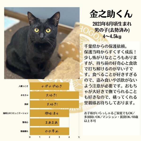 | 特徴(性格など) | 天真爛漫で元気な男の子です!人が好きで自分から膝に乗ってきたり、おもちゃで遊ぶことも大好きなので、構ってくださる里親様の方がこの子も寂しくないかもしれません。 子猫特有の好奇心から誤飲や落下物、脱走などの注意は必要になるかと思いますが、対猫ちゃんへのコミュニケーション能力も高いので多頭飼いにも向いていると思われます。 最近は大人っぽくなり、初めましての場所や人には少し縮こまってしまいますが、食欲と元々の好奇心が旺盛のため、慣れるのは早い方だと思います。 一緒に遊んだり、甘えん坊な子が良いという里親様お待ちしております! |