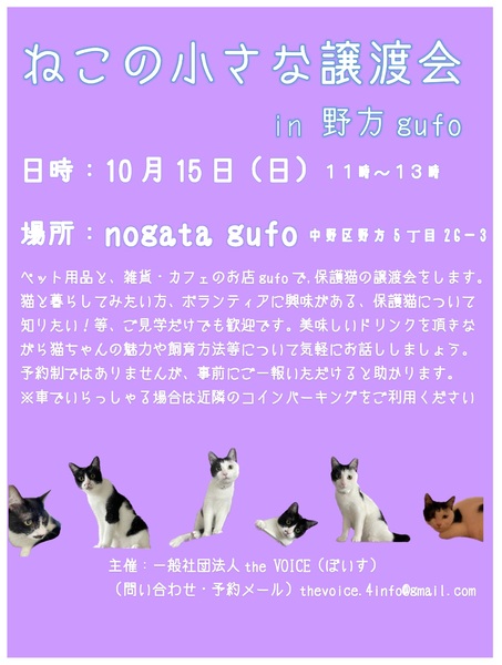 | その他(譲渡条件など) | 当法人の代表メールでのやりとりの後、譲渡会もしくはお見合いを設定させていただきます。両者の合意が得られたら、後日、改めてトライアルとなります。 トライアルまでに、ケージ(必須)、餌皿、水皿、シート、推奨フードなどをご用意ください。 準備ができましたら、ご自宅までお届けにあがります。 およそ3、4週間のトライアル後、譲渡希望される場合は、譲渡契約書を交わしたのち正式譲渡成立となります。 |