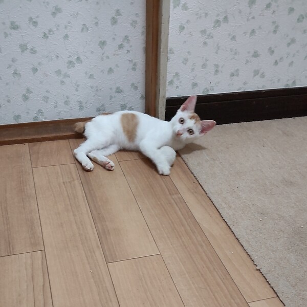 | 特徴(性格など) | 白に茶色のもようがあります。茶色で5cmくらいの短いしっぽがとてもかわいい、元気な♂️です。ひとりでおもちゃをみつけて、たくさん遊ぶと、白い耳が赤くなります。肉球は、ピンク色。賢い子 | ||