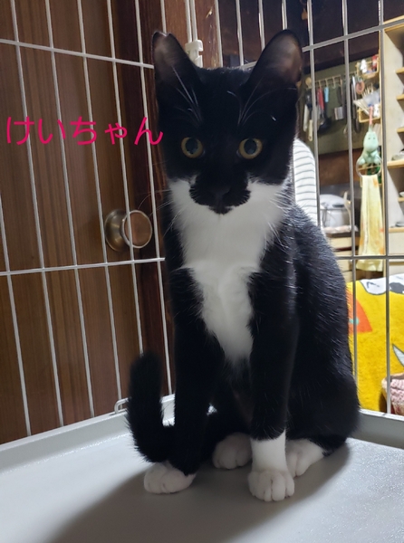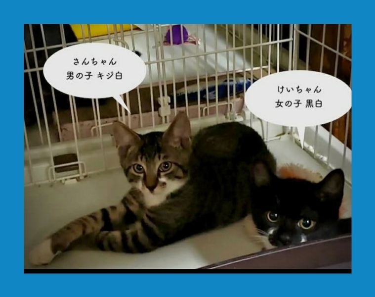 | 特徴(性格など) | キジシロの男の子 さんちゃんは人見知りしない穏やかさんです。黒白の女の子 けいちゃんは少し慎重派ですが人馴れもしており、甘えん坊さんです。ウイルス検査(-)マイクロチップ挿入済みです。 | ||