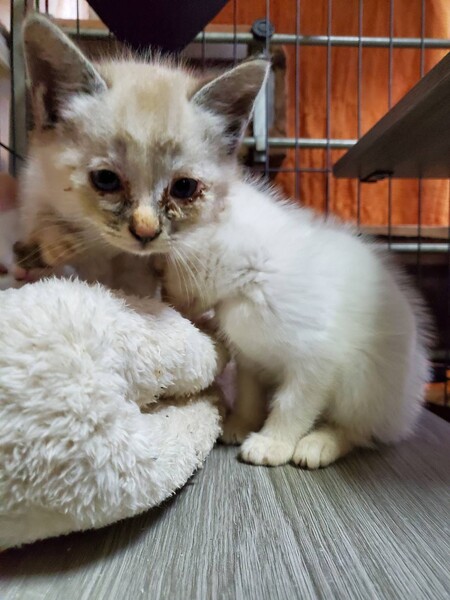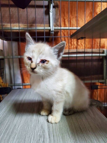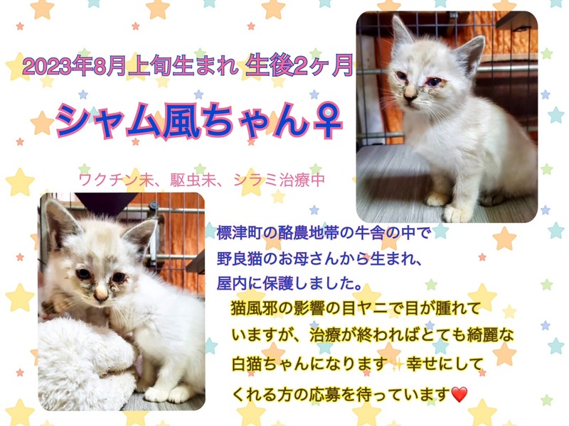 | 特徴(性格など) | ※保護主からの依頼で代理募集。 【仮名】シャム風ちゃん 【生年月日】推定2023年8月3日頃生まれ 【種類】MIX 【毛色】シールリンクスポイント 【性別】メス 【性格・その他】まだほんの子猫なため性格の個性はこれから現れると思います。 保護宅では現在、犬とも一緒に生活しています。 ◆健康状態 【避妊】未(適正時期に必ず避妊手術をお願いします) 【ワクチン】未 【駆虫】未(シラミ治療中) ※猫風邪の影響の目やにで目が腫れていますが、治療が終わればとても奇麗な白猫ちゃんになると思います。 |