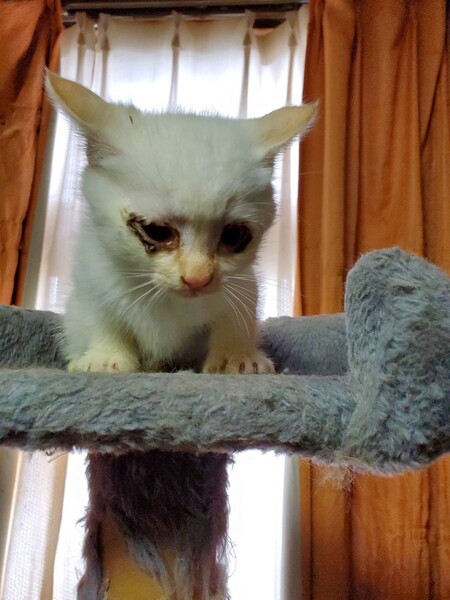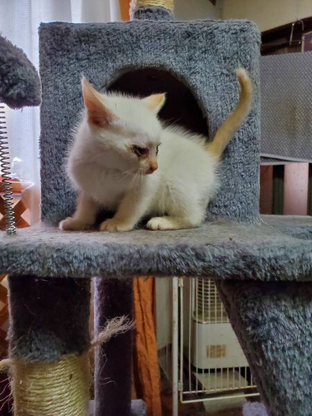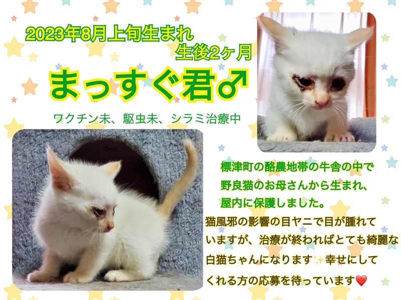 | 特徴(性格など) | ※保護主からの依頼で代理募集。 【仮名】まっすぐ君 【生年月日】推定2023年8月3日頃生まれ 【種類】MIX 【毛色】バイカラー 【性別】オス 【性格・その他】まだほんの子猫なため性格の個性はこれから現れると思います。 保護宅では現在、犬とも一緒に生活しています。 ◆健康状態 【去勢】未(適正時期に必ず去勢手術をお願いします) 【ワクチン】未 【駆虫】未(シラミ治療中) ※猫風邪の影響の目やにで目が腫れていますが、治療が終わればとても奇麗な白猫ちゃんになると思います。 |