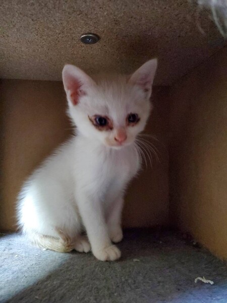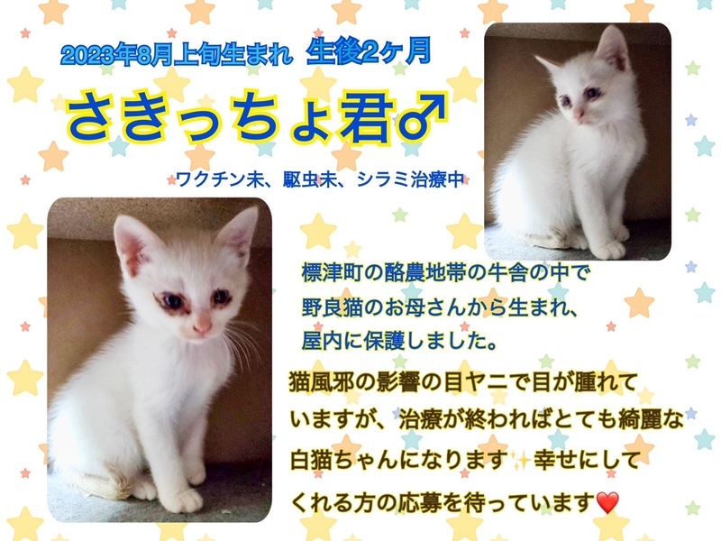 | 特徴(性格など) | ※保護主からの依頼で代理募集。 【仮名】さきっちょ君 【生年月日】推定2023年8月3日頃生まれ 【種類】MIX 【毛色】ホワイト 【性別】オス 【性格・その他】まだほんの子猫なため性格の個性はこれから現れると思います。 保護宅では現在、犬とも一緒に生活しています。 ◆健康状態 【去勢】未(適正時期に必ず去勢手術をお願いします) 【ワクチン】未 【駆虫】未(シラミ治療中) ※猫風邪の影響の目やにで目が腫れていますが、治療が終わればとても奇麗な白猫ちゃんになると思います。 【兄妹猫】 ・掲載No:C343734/まっすぐ君♂ ・掲載No:C343732/シャム風ちゃん♀ |
