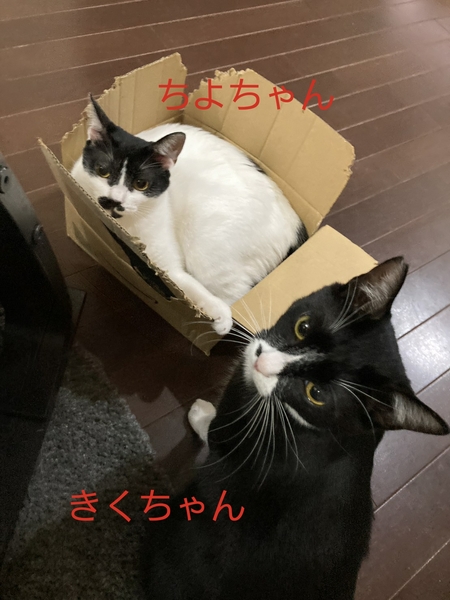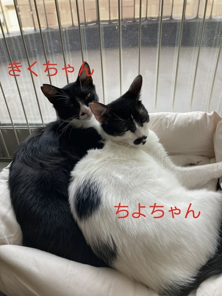 | 特徴(性格など) | ⚫菊ちゃん(黒多め) 勝気、遊び好き、甘えん坊(お膝が大好き) ⚫千代ちゃん(白多め) のんびり(どんくさい?)、遊び好き 甘えん坊(菊ちゃんがお膝にいなければすぐお膝に来ます) 甘えん坊 お膝奪い愛姉妹ですが 一頭ずつ譲渡可能です。 |