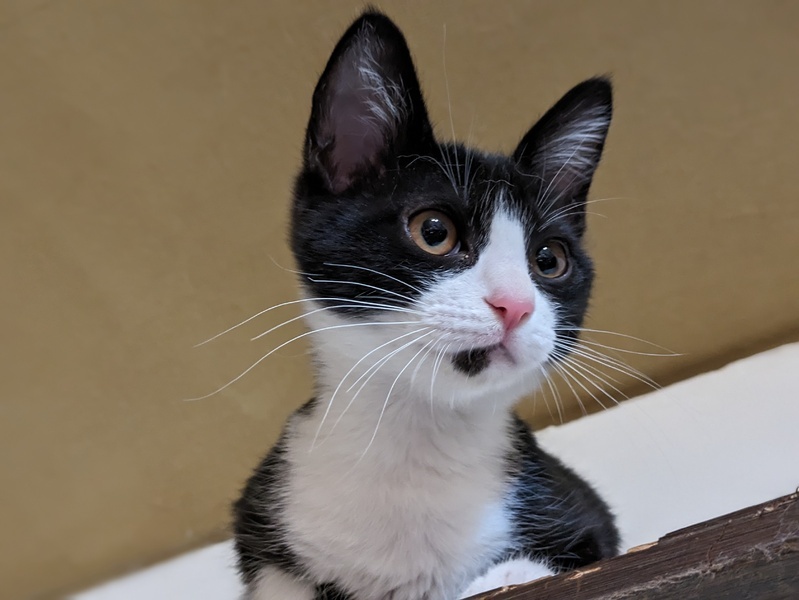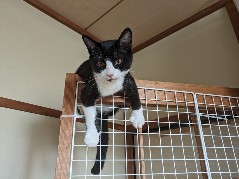 | 特徴(性格など) | お顔も性格も優しいハチワレちゃんです。 遊ぶときは大暴れし、眠いときは踏まれても眠れるマイペースな子です。 少し怖がりな一面も有ります。 尻尾は長いです。 |