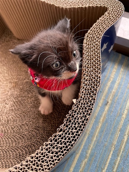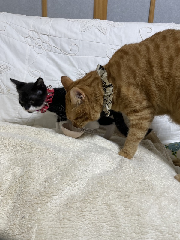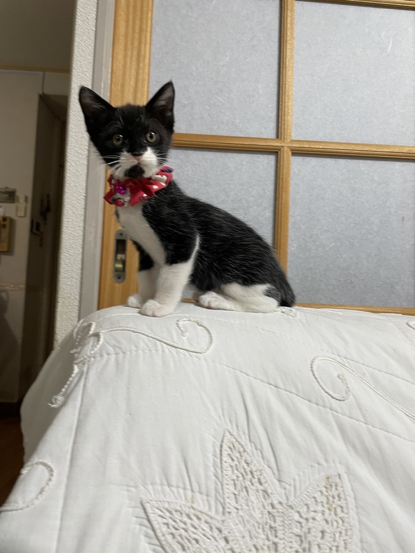 | 特徴(性格など) | 保護された9月5日の体重は150gでとてもちいさく、ガリガリに痩せていたそうですが、歯が生えていたそうですので、推定お誕生日は、8月15日頃かと思われます。 保護されてからは、ミルクや離乳食で少しずつ大きくなり、9月末頃に体重が500gを超えました。 今は、毎日よく食べてよく寝て、すくすく成長中です。 とても幼い頃に保護されましたので、人に対する警戒心はありません。 10月20日にワクチン1回目接種し、血液検査したところ、猫エイズと白血病ともに陰性でした。 また、体重は900gになっていました。 |