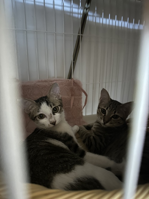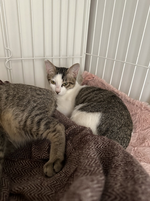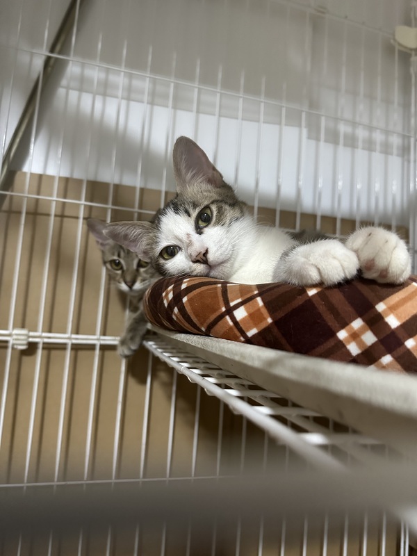| 特徴(性格など) | キジ→女の子 リンちゃん 慎重派、頭のいい子、チュール大好き 白サビ→男の子 はくちゃん リンちゃんにちょっかいかけては反撃にあってます。 兄妹取っ組み合い始まるとハクリンと呼ぶとピタっとやめます。 |