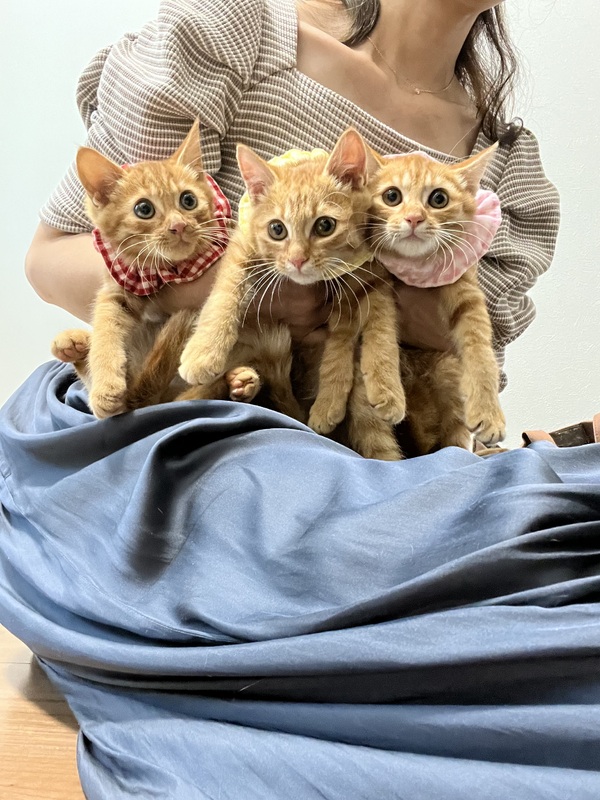 | 里親募集する理由 | 夏に知人の自宅の庭先にちゃとらの猫が やってくるので餌をやっているけど どうしたら良いか相談がありました。 餌をやり続けると 近い将来、不幸な猫が生まれてしまうので 捕獲器で捕まえ手術をし 地域猫としてお世話してもらう事にしました。 手術を終えたあと 先生からこの猫さんは産後と言われました。 子猫がどこかで待っている!! と慌てて捕獲した場所にリリースし 餌やりは毎日知人がしてくれましたが、 2ヶ月経った今月、 さくら猫ママがとうとう 3匹のちゃとらの子供を連れて 現れました… 毎日、人間から餌を貰っていたママの子供は 警戒心もなく無邪気で 保護しないと虐待などの恐れもあるし 10月に入り保護致しました。 保護してすぐに病院へ連れて行き 初期ケアをしました。 今、子猫たちは知人のお家でお世話してもらっています。 皆、幸せなお家の子になって欲しいです! 寒い冬が来る前に どうか素敵なご縁がありますように… よろしくお願い致します。 |