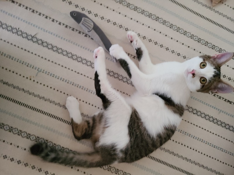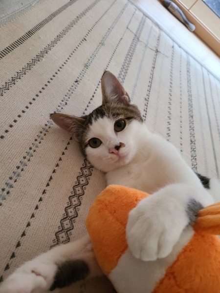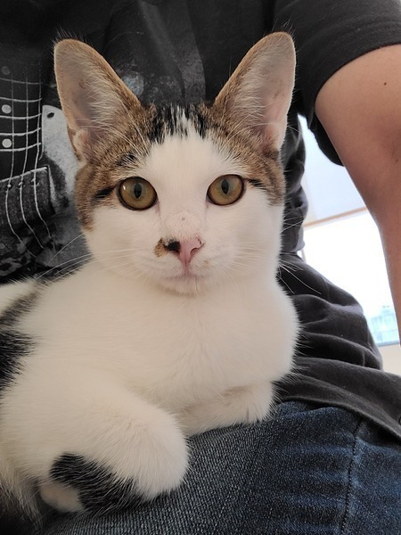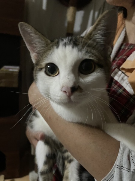 | 特徴(性格など) | とっても甘えん坊な性格です。 とても人懐っこいです。 瞳はイエローでお耳が大きく可愛いお顔です。毛色はシロキジです。 尻尾はカギしっぽです。 近づいただけでもゴロゴロと喉を鳴らしてくれます。 |