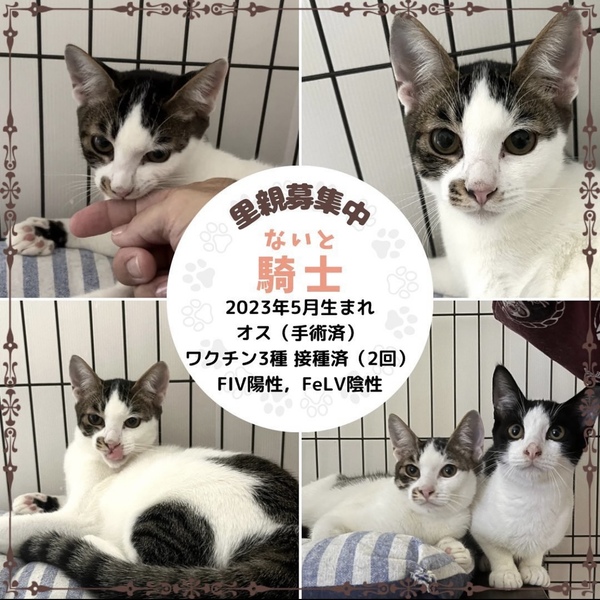 | その他(譲渡条件など) | 基本的には定期的に開催している譲渡会にて、 猫と触れ合っていただきながら面談させていただければと思います。 譲渡会情報はイベントをご覧ください 個別お見合いも可能ですので、まずはご相談ください。 譲渡にあたっては ・トライアル(お試し飼育) ・譲渡費用のお願い ・契約書記入 このような流れをお願いしております。 お問合せ、お待ちしております! |