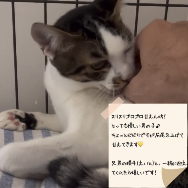 | 特徴(性格など) | すりすりゴロゴロな甘えん坊! とても優しい男の子です❤️ ちょっとビビりですが、尻尾をあげて甘えてきますよ! 兄弟の瑛斗と一緒にお迎えしてくれると嬉しいです☺️ |