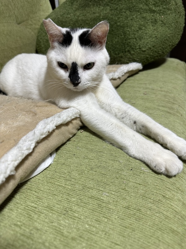 | 里親募集する理由 | 最初から人馴れしており、首にかなり酷い怪我をしており、アライグマ一家5匹も毎日のように出没していたため緊急保護しました。治療も1か月かかりましたが傷跡もなくきれいに完治し元気になりました。 我が家に来て一年になり、先住猫、老猫もいるため1匹で可愛がっていただけるご家庭にと思っております。我が家では1番ペーペーですが 威張って、先輩猫に喝をいれられてますが全くへこたれません。 憎めない天真爛漫な性格です。 やんちゃで、ユーモアたっぷり、愛嬌抜群、マメ、コテリンというと柔道の受け身のようにコテとひっくり返ります。怒られたあともコテリンとします。いつもへそ天大の字で寝ます。 |