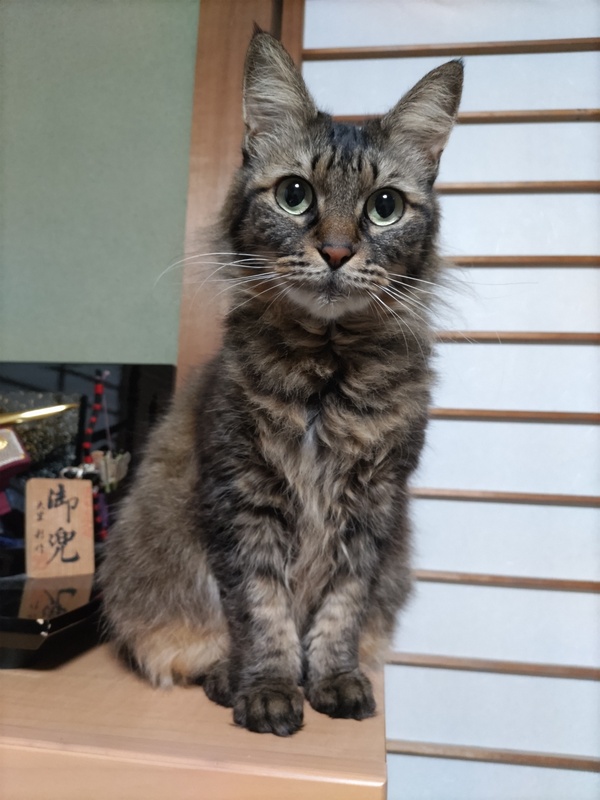 | 特徴(性格など) | 人馴れ抜群、すぐに膝の上に乗ってこようとします。 おめめパッチリ、珍しいサビトラの長毛です。 尻尾の先が書道の筆のような形をしていて、とっても可愛いです。 トイレもすぐに出来ました。 とても人懐っこく、撫でられたりおもちゃで遊ぶのが大好きです。 |