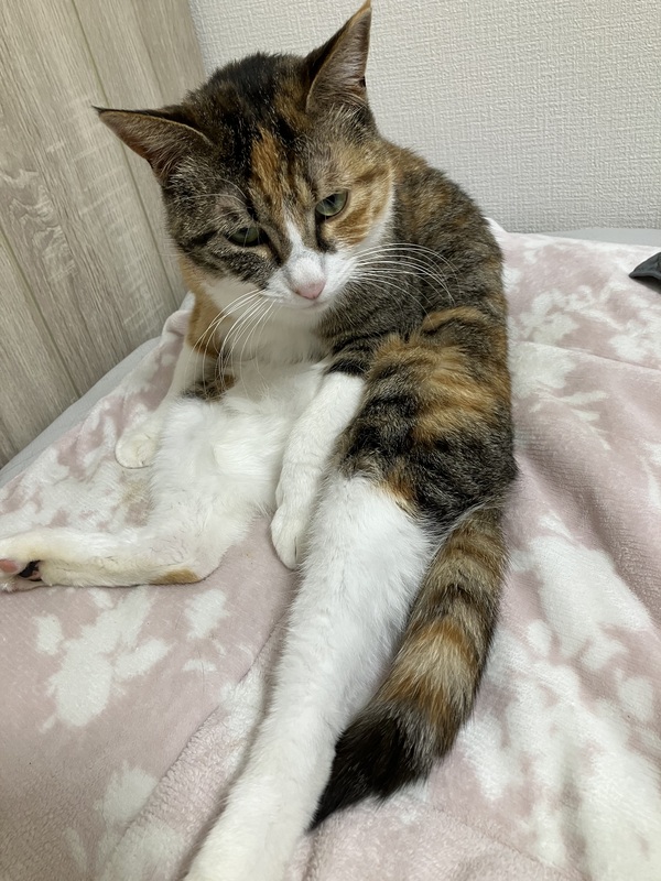 | 特徴(性格など) | シマ三毛の女の子です。 女の子らしく慎重で臆病な一面も有りますが、とても甘えん坊で可愛い声で撫でてーと要求すぐにお腹を出してゴロンゴロンしてます。 抱っこは苦手で長くは出来ませんが、穏やかで爪切りもシャンプーも大人しく家具や壁で爪研ぎする習慣もありません。 引越してすぐは隠れたり、トイレ失敗したりしました「うちで預かり始めたとき」 後はやきもち焼きな感じがします。 |