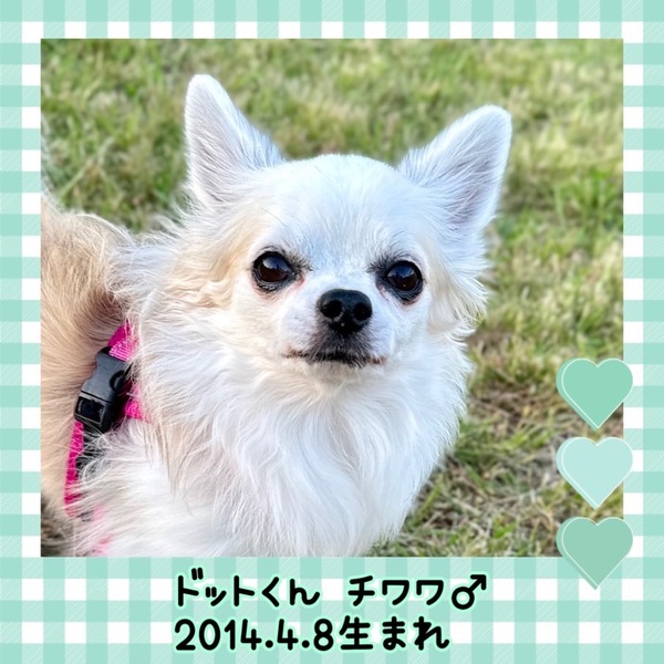| 特徴(性格など) | 名前 ドット 種類 チワワ 色 ブルーフォーン&ホワイト 年齢 2014/4/8 性別 オス 体重 3.3kg ..................... ワクチン 5種混合接種済 フィラリア 陰性(ー) マイクロチップ 装着済 避妊去勢手術 済 メディカルチェック 聴診触診、血液、検便、異常なし、 駆虫薬投与、ノミダニ駆除済、スケーリング済 ..................... シニアですがお散歩大好き、ご飯もしっかり食べます。 落ち着いていて、無駄吠えもありません。 名前を呼ぶと駆け寄って来てくれます。 JKCチャンピョンになった子なので、とても美しいお顔です。 |